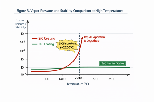 Estabilidad termodinámica inigualable: el carburo de tantalio (TaC) cuenta con un asombroso punto de fusión de 3880 °C. Según una investigación publicada en el Journal of Crystal Growth, los recubrimientos de SiC sufren una "evaporación incongruente" por encima de los 2200 °C, donde el silicio se sublima más rápido que el carbono, lo que provoca degradación estructural y contaminación de partículas. Por el contrario, la presión de vapor del TaC es de 3 a 4órdenes de magnitud más bajos que el SiC, manteniendo un campo térmico prístino para el crecimiento de cristales.